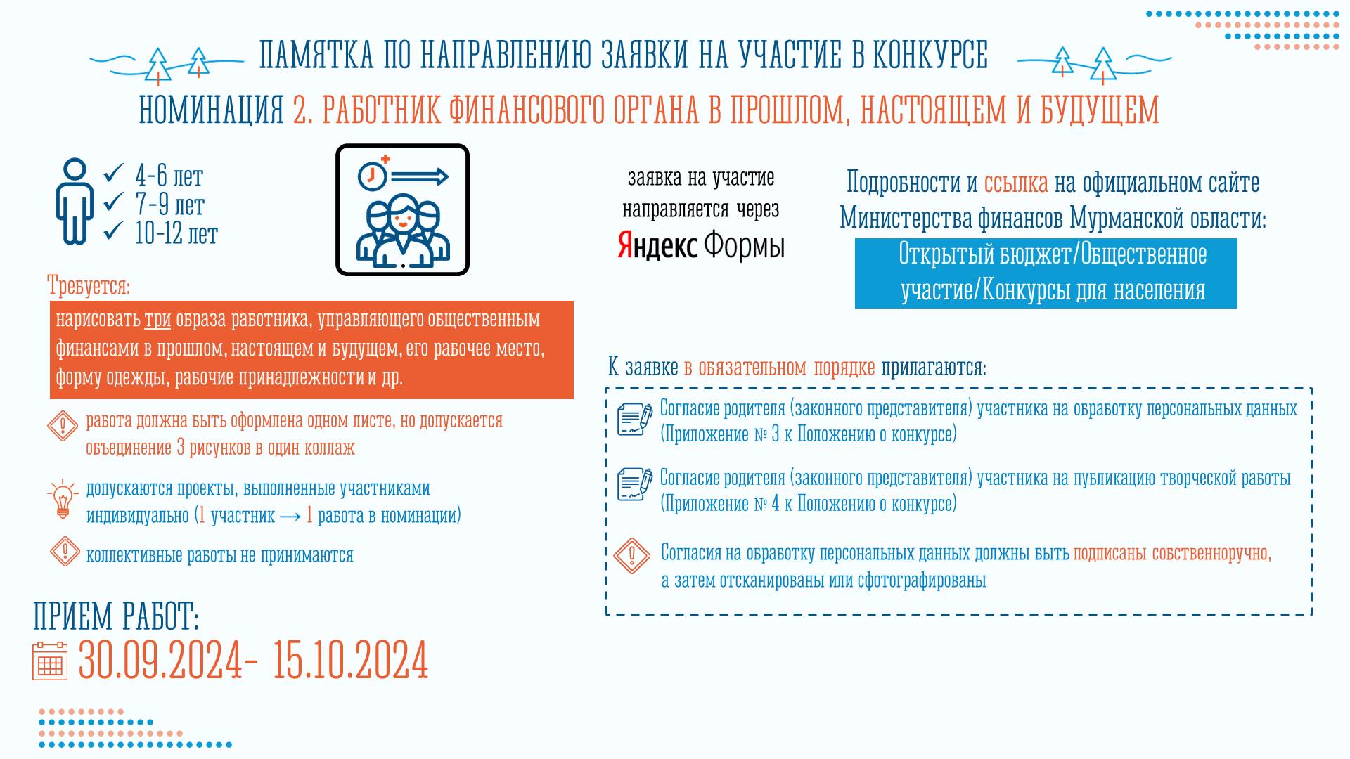 - для совершеннолетних участников: согласие участника конкурса на обработку персональных данных и согласие на размещение конкурсных работ на информационных ресурсах Министерства финансов Мурманской области;